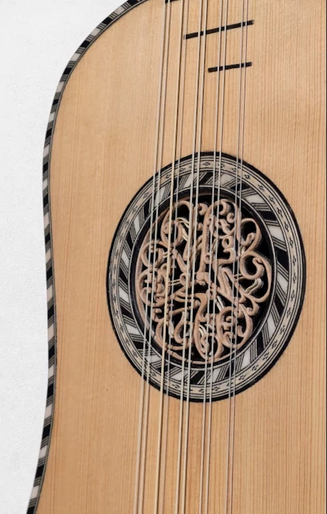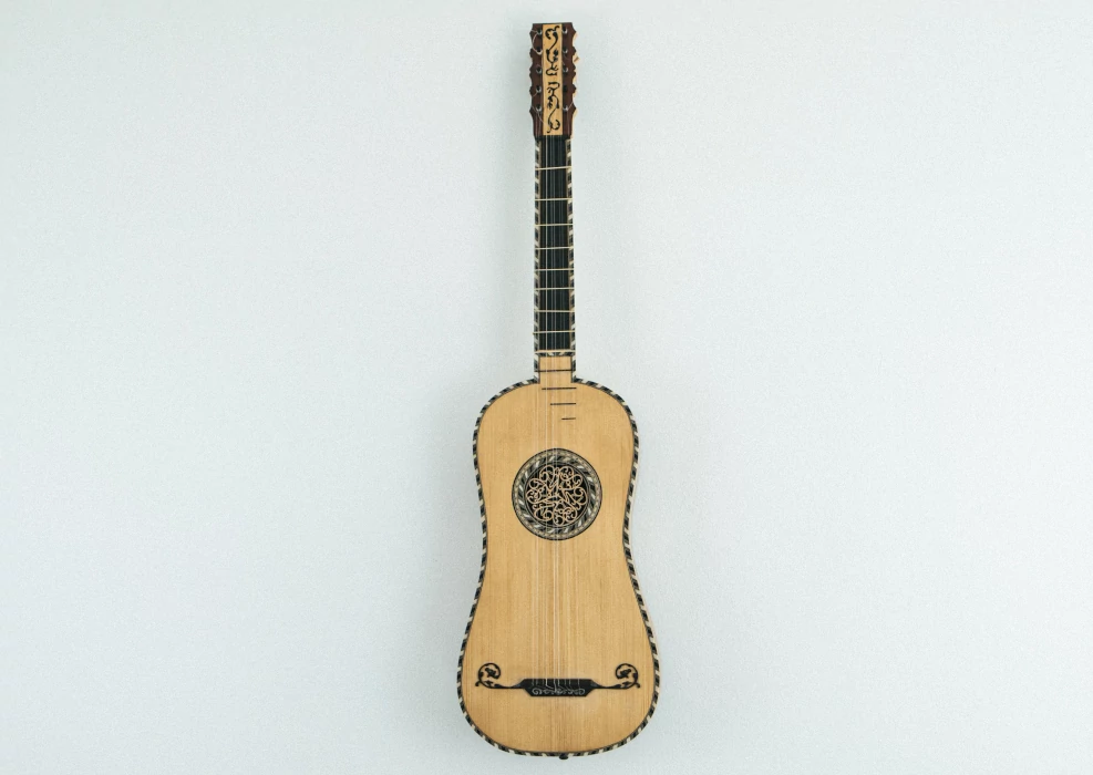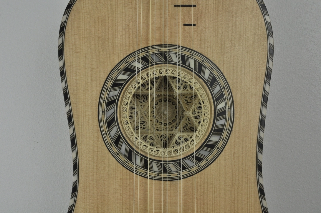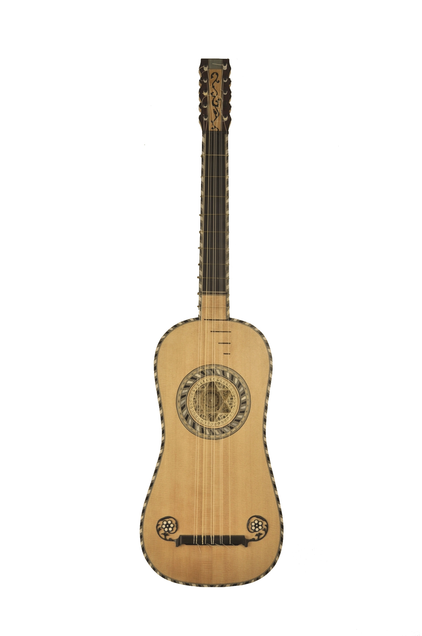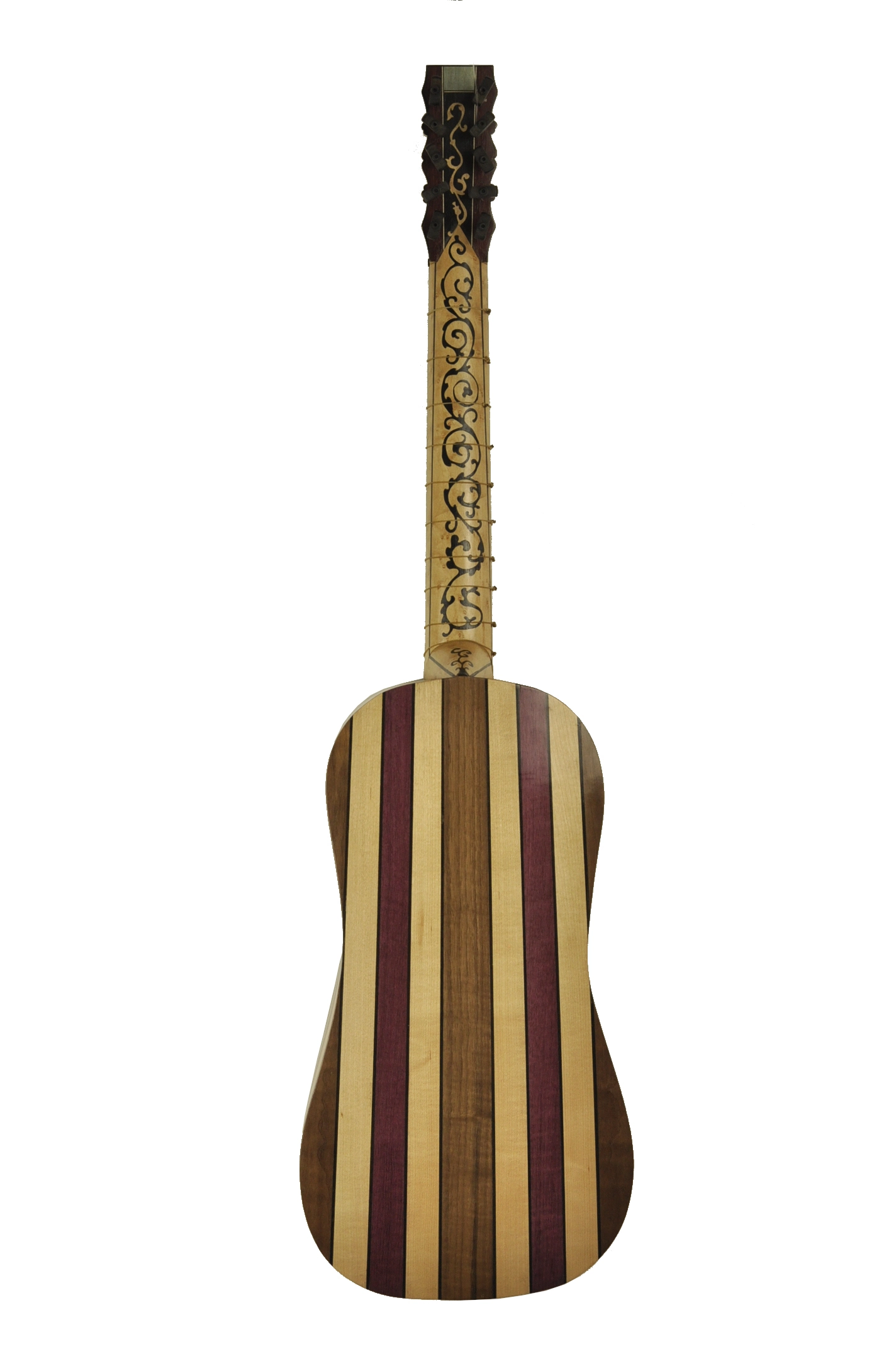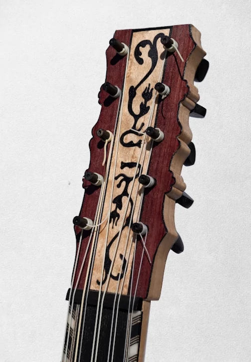 Modèle fantaisie inspiré de la guitare baroque attribuée à René Voboam datée de 1641 conservée à Oxford au Ashmolean Museum, collection Hill n°40.