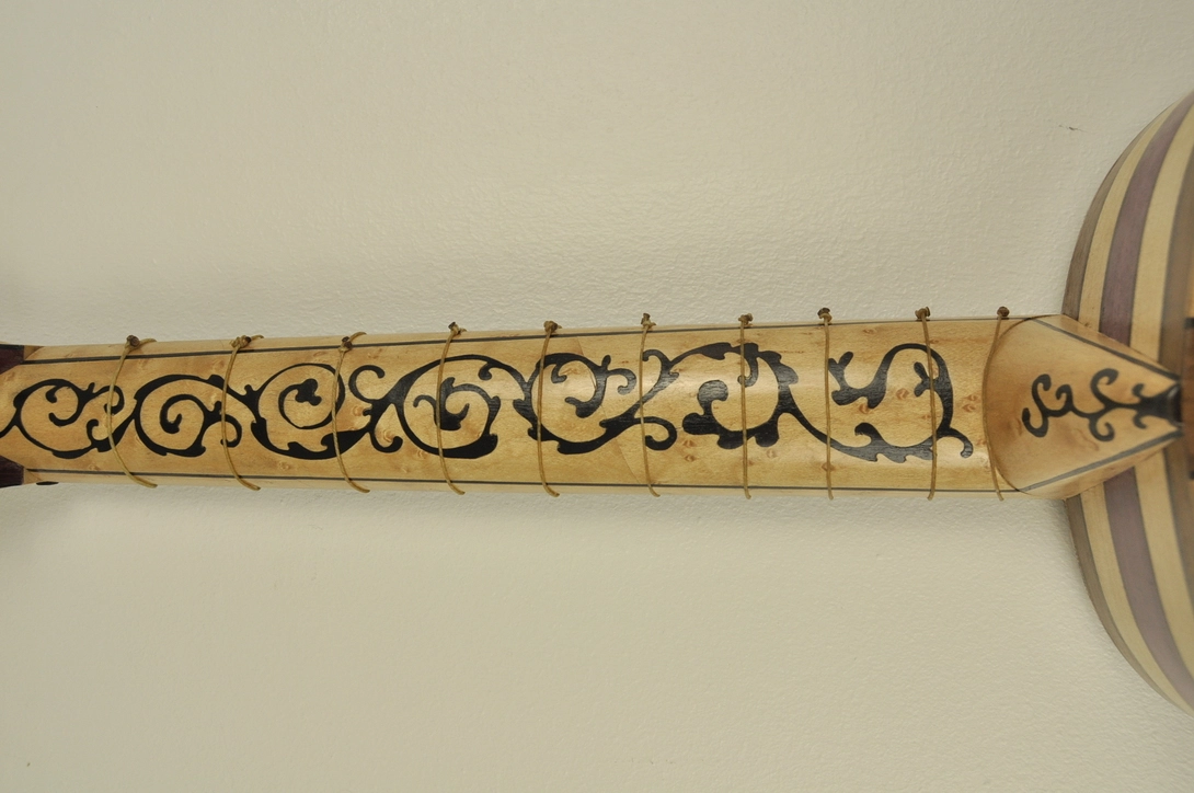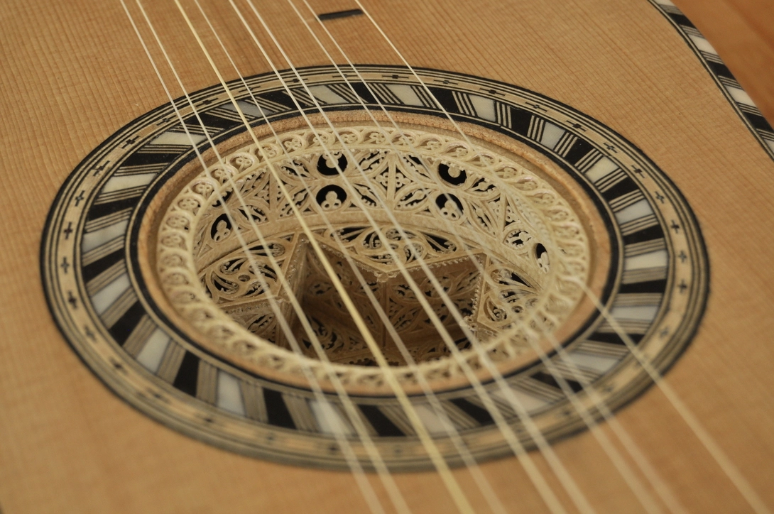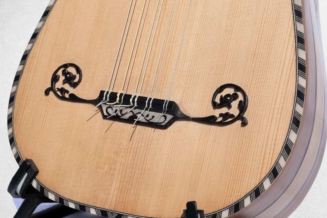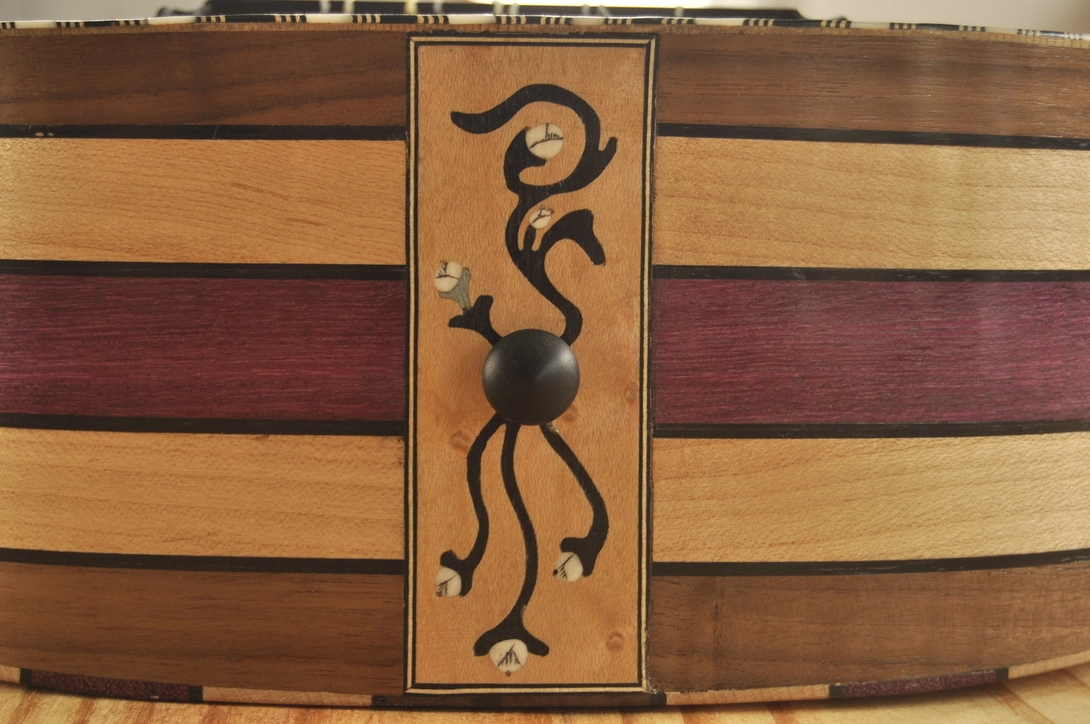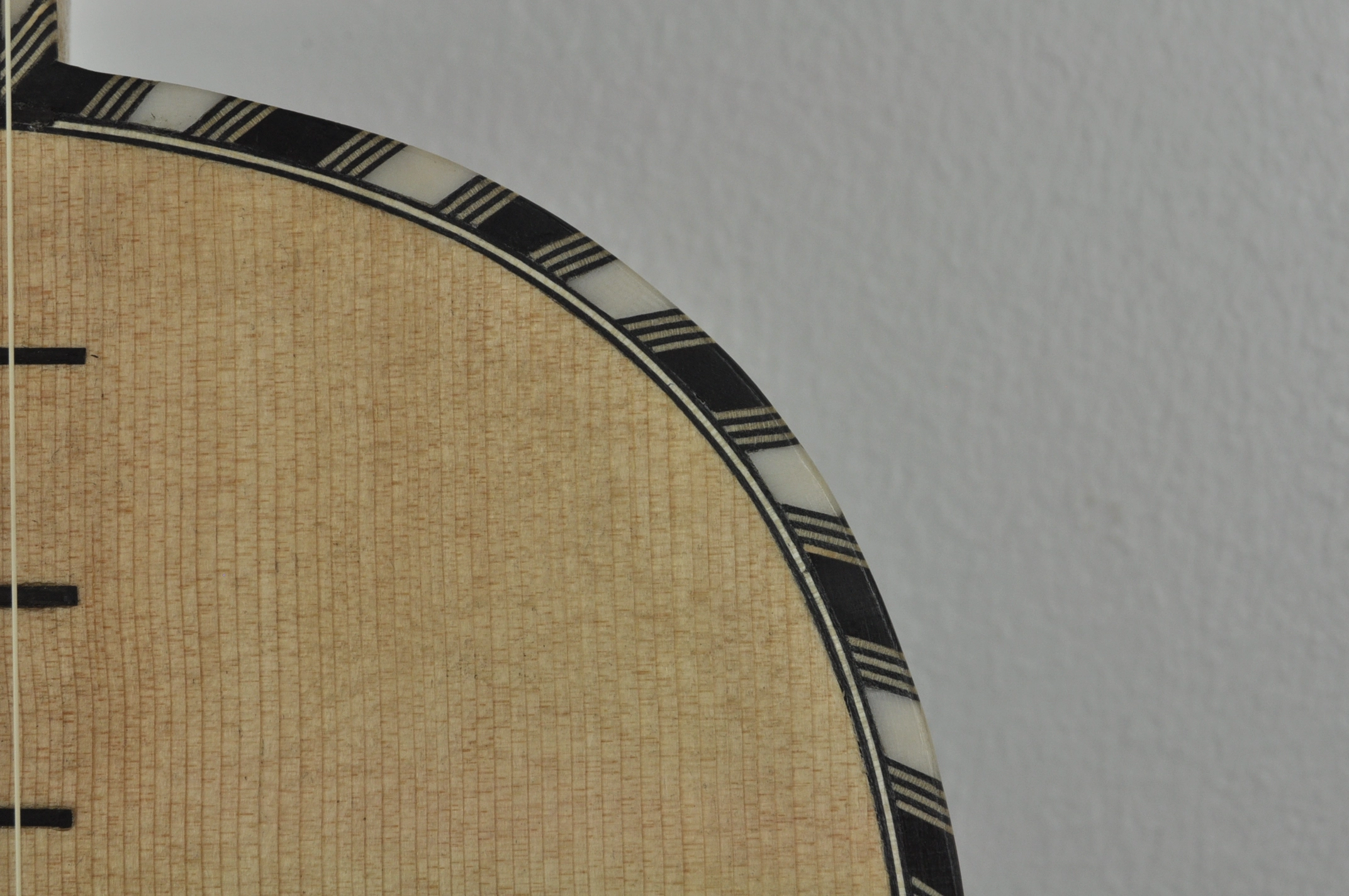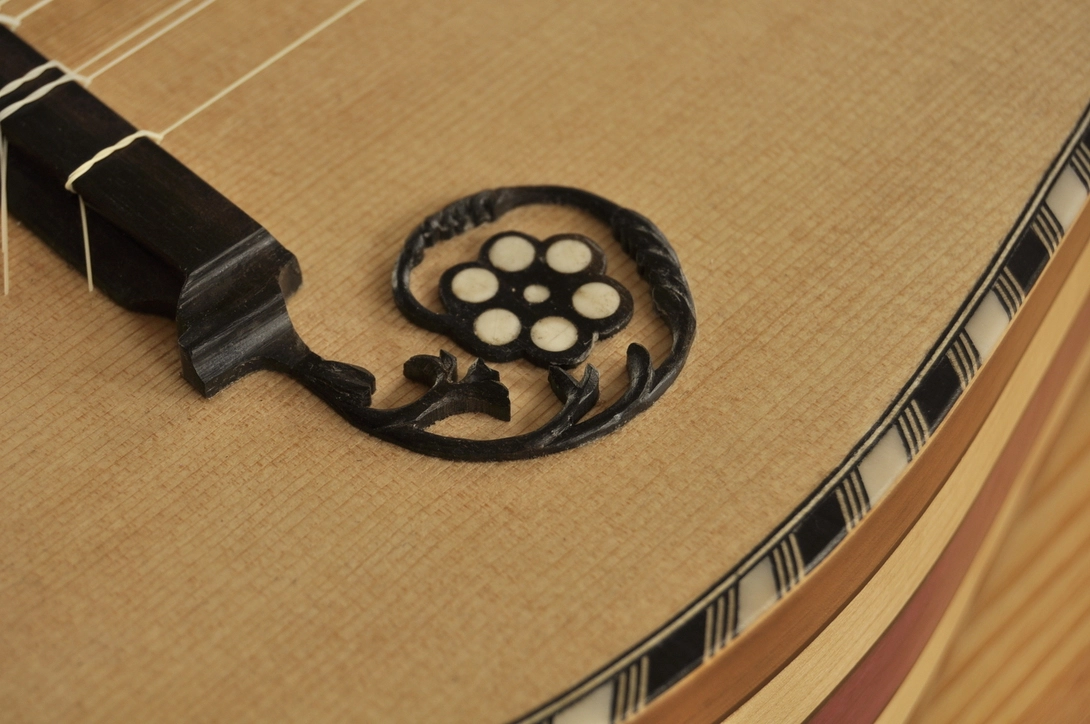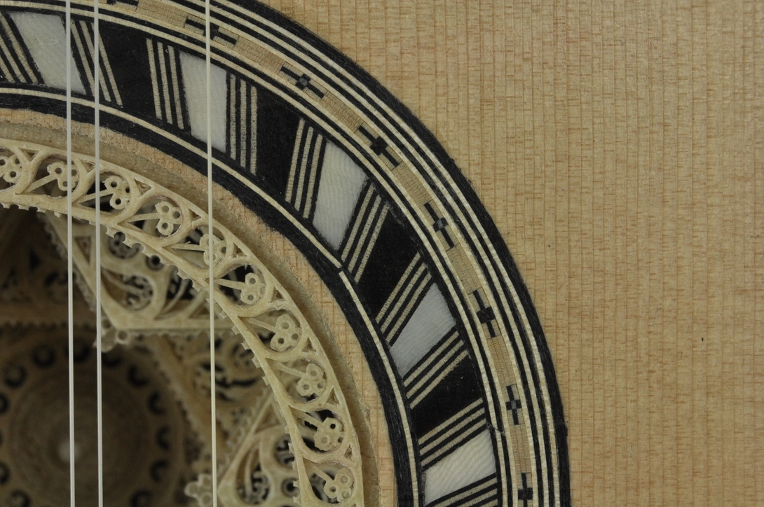 Matériaux : éclisses et fond de caisse composés de côtes de trois essences de bois, érable, noyer et amarant séparés par un filet d’ébène. Table d’harmonie en épicéa sitka. Manche en érable plaqué de marqueterie en érable moucheté et érable teinté noir. Marqueterie du cheviller en amarante, érable moucheté, érable teinté noir bordé d’un filet d’érable teinté noir. Pistagne décorative en ébène, ivoire végétal et érable blanc et teinté noir. Chevalet et moustaches en ébène et en os. Rosace extérieure marquetée en ivoire végétal, ébène, érable blanc et teinté noir. Rosette en parchemin à 5 étages. Bouton de sangle, sillet de tête et chevilles d’accordage en ébène. Diapason en ébène bordé de pistagne en ébène, ivoire végétal, érable blanc et teinté noir.